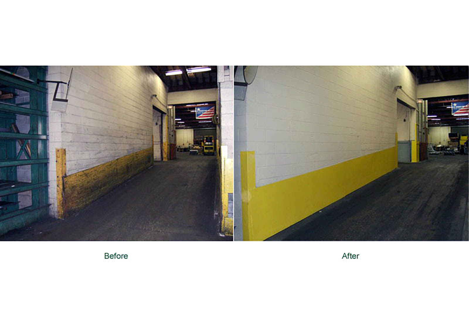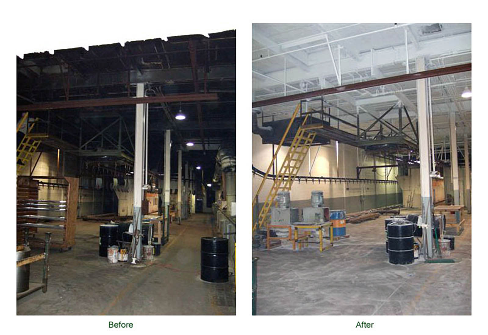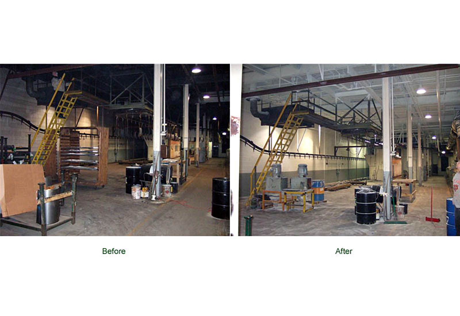 Before and After photos of a Factory, Shipping Department, Stairwell, Mechanical Room and Piping System. Let Stried Painting, Inc. clean up and give your facility a bright new look.