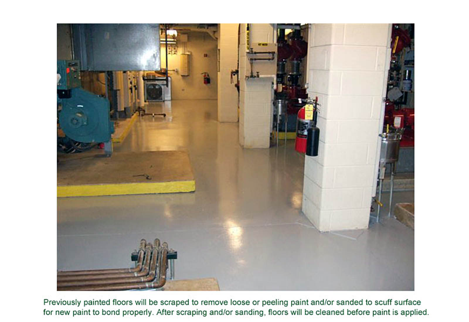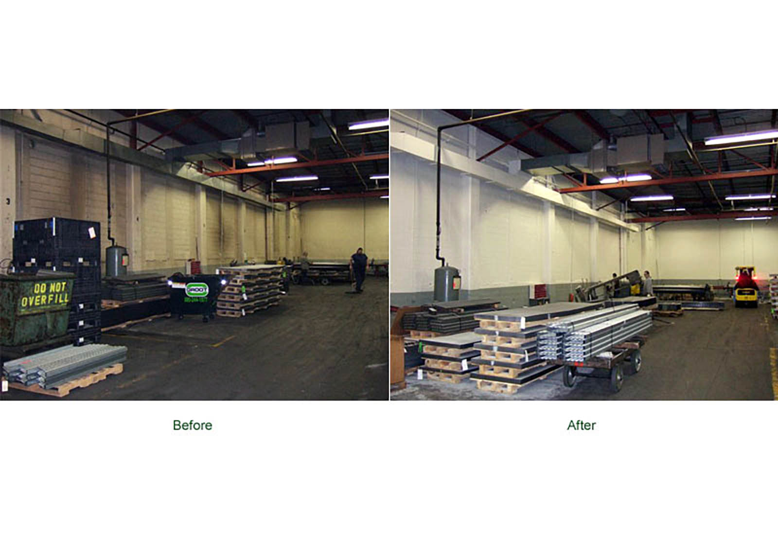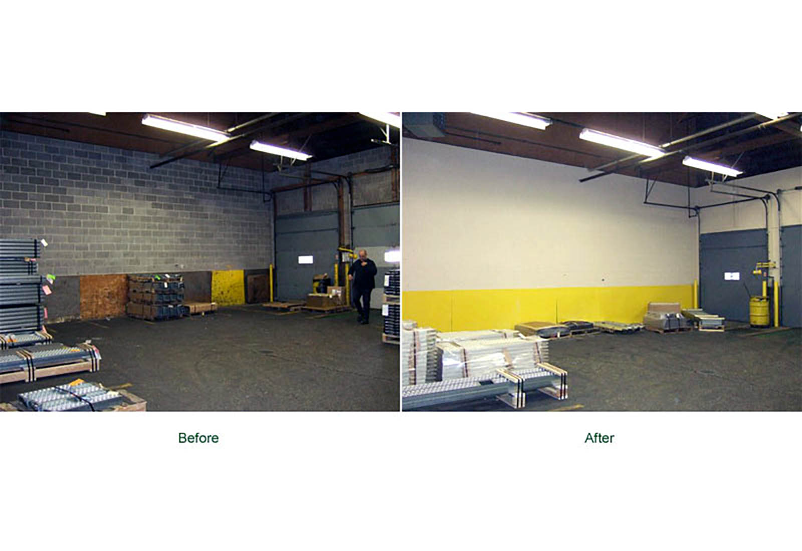 Before and After photos of a Factory, Shipping Department, Stairwell, Mechanical Room and Piping System. Let Stried Painting, Inc. clean up and give your facility a bright new look.
