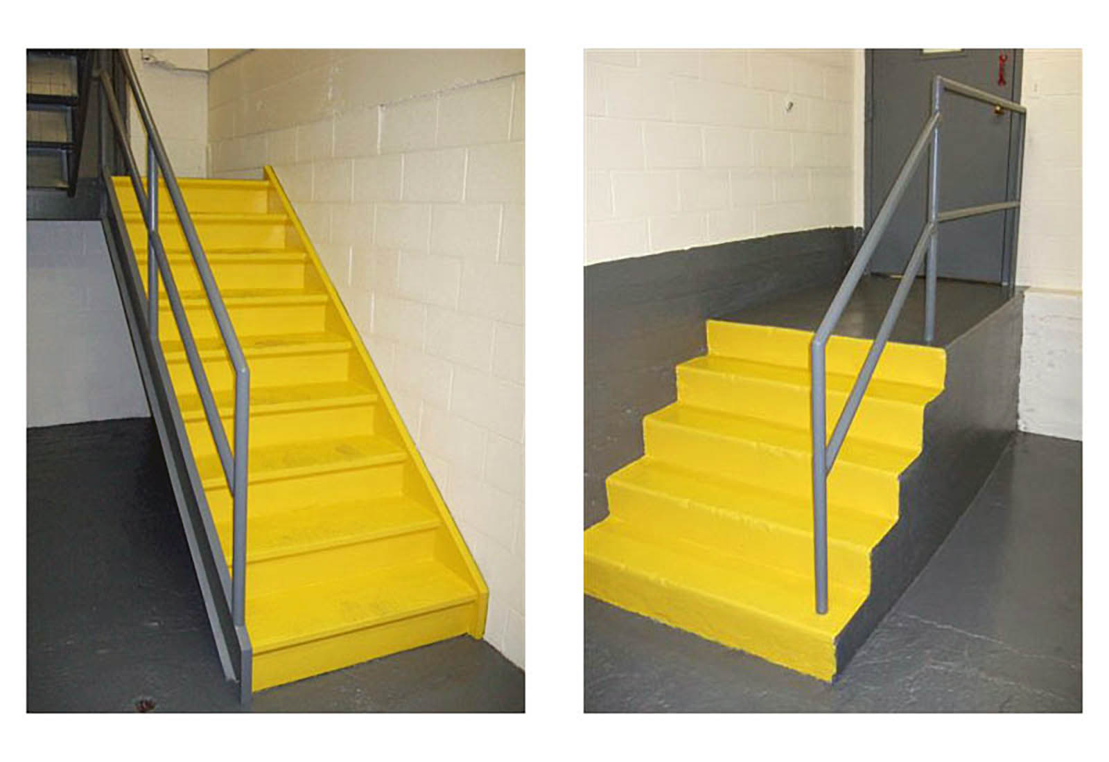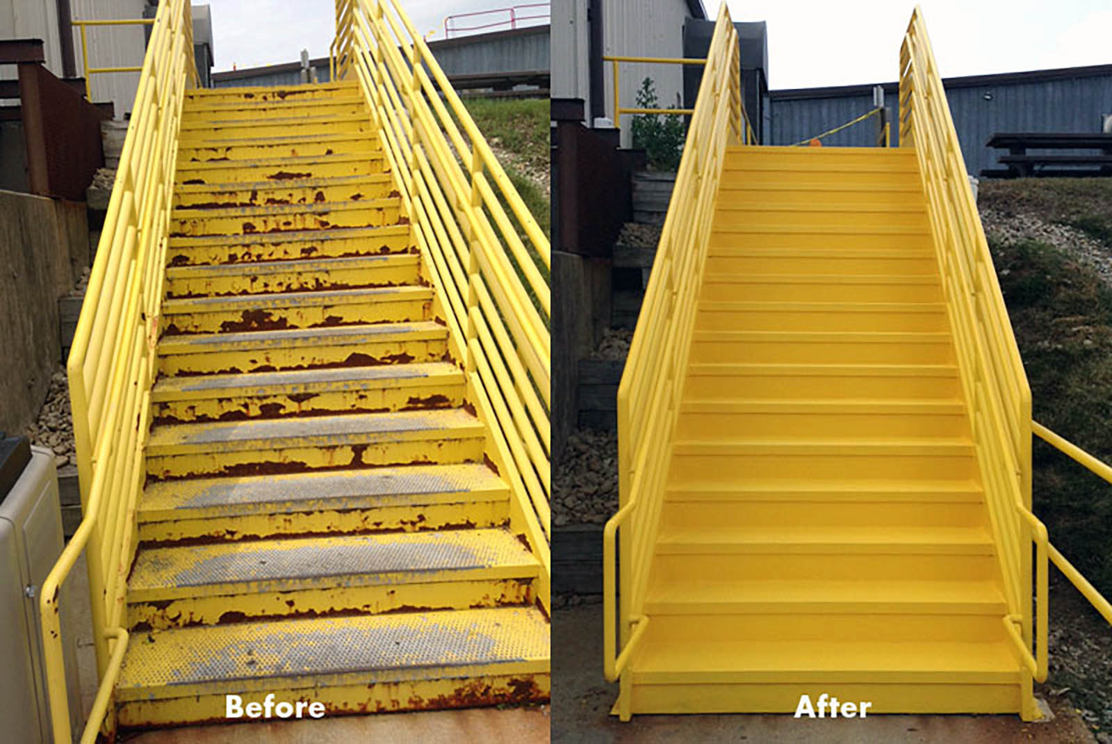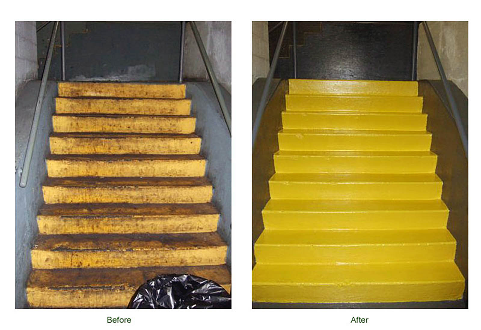 Before and After photos of an exterior staircase prep-and-paint project completed in Mundelein, Illinois. The staircase was washed, hand scraped, primed and painted in Safety Yellow.